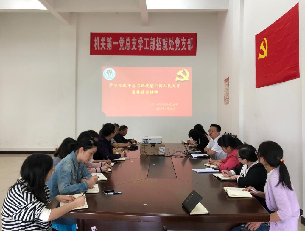 4月28日下午,学工部招就处党支部书记任江林主持召开支部大会,传达学习习近平总书记在中国人民大学考察时的重要讲话,布置近期工作。