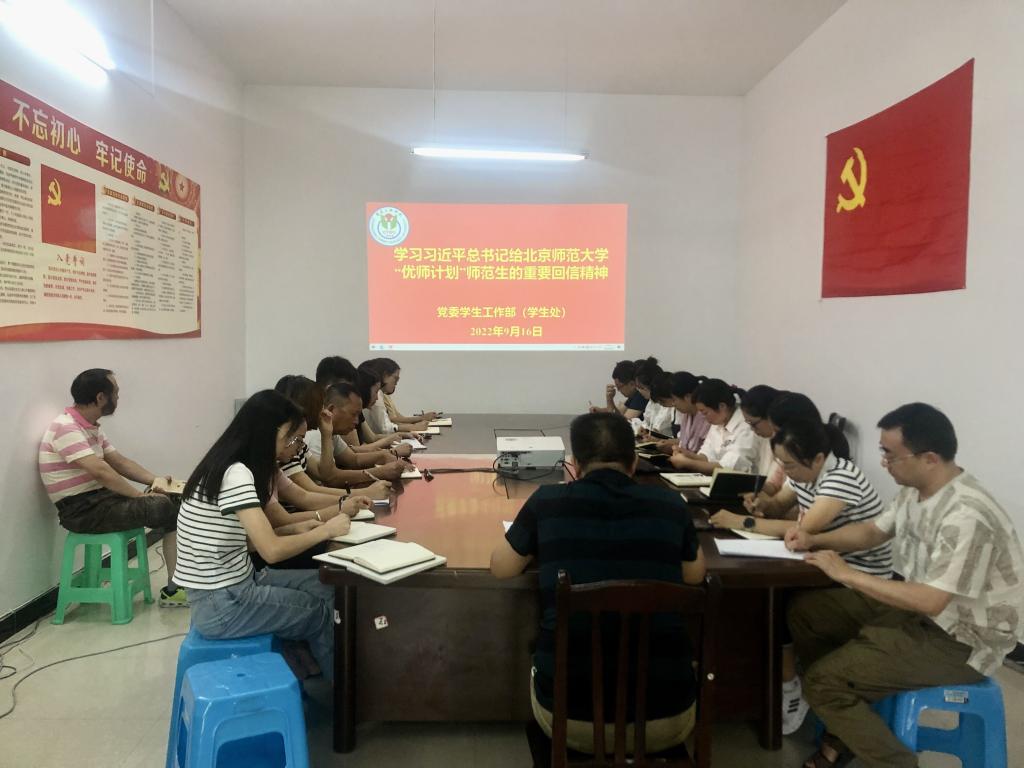 2022年9月16日,党委学生工作部部长任江林在众创空间102会议室主持召开全体职工政治学习会,专题学习习近平总书记给北京师范大学“优师计划”师范生的重要回信精神,安排贯彻落实工作。