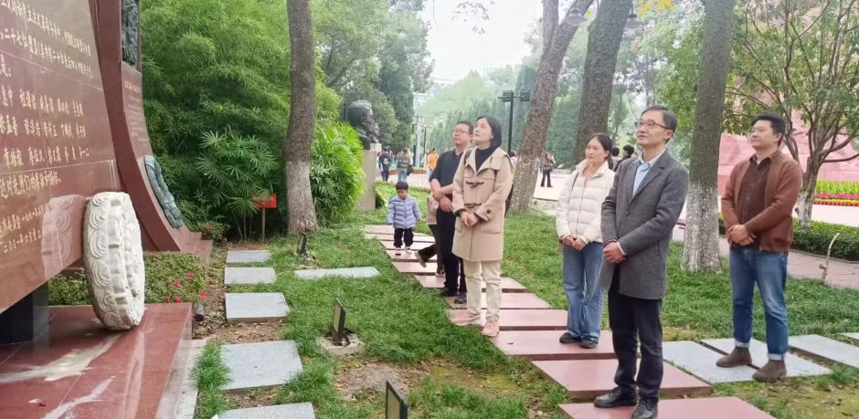 在歌乐山革命烈士陵园,在烈士事迹陈列碑前,党支部书记刘文菘为全体党员带来了一堂沉浸式的微党课。他讲述了红岩革命烈士们在渣滓洞、白公馆关押期间同敌人继续斗争的历史事迹;讲述了“英烈家书”“狱中八条”的诞生和红岩精神的培育与形成。