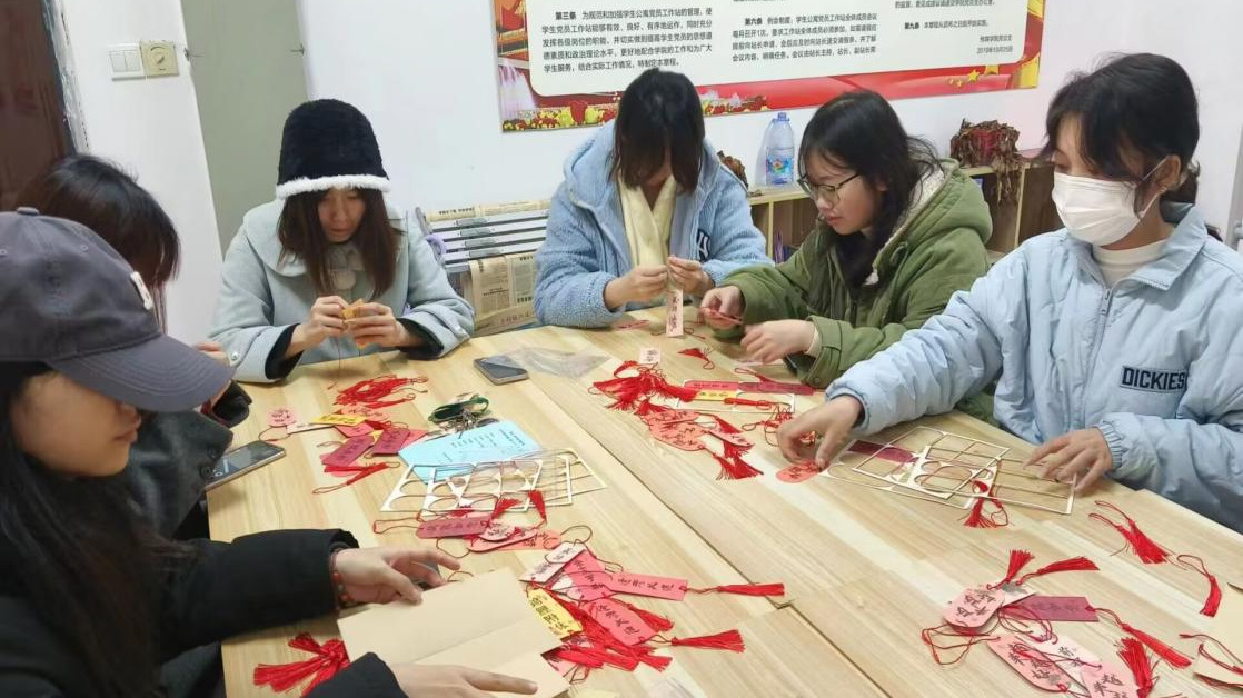 下午,党支部同志早早来到学生公寓党员工作站,一起动手制作了精美的书签,并在书签上写下了励志的话语、温暖的祝福。晚上,大家走进学生社区,深入考研学子宿舍,将这些承载着祝福和鼓励的书签送了出去为考研学子们加油助威。小小书签寄托着学院党员师生的无限祝福,为考研学子们带去了鼓励与支持,让他们在“研”途中处处皆暖。