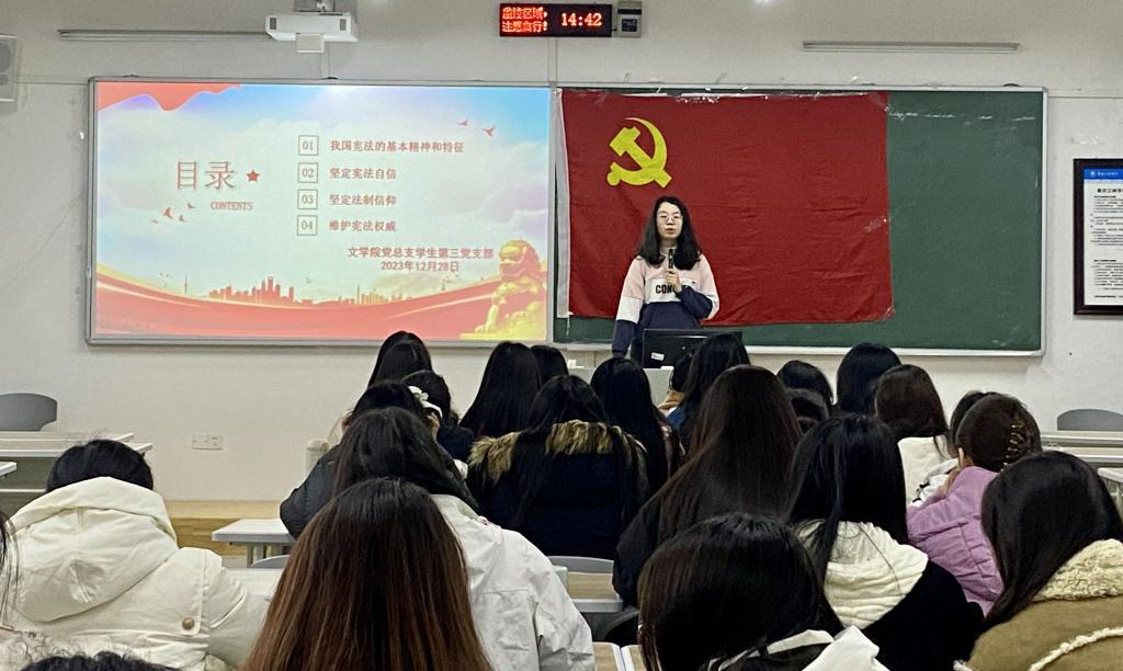 为进一步彰显中国特色社会主义的道路自信、理论自信、制度自信和文化自信,增强全社会的宪法意识,2023年12月28日,文学院党总支学生第一、第二和第三党支部在博学楼2栋104室开展本月主题党日活动,党支部书记、正式党员和预备党员参加。