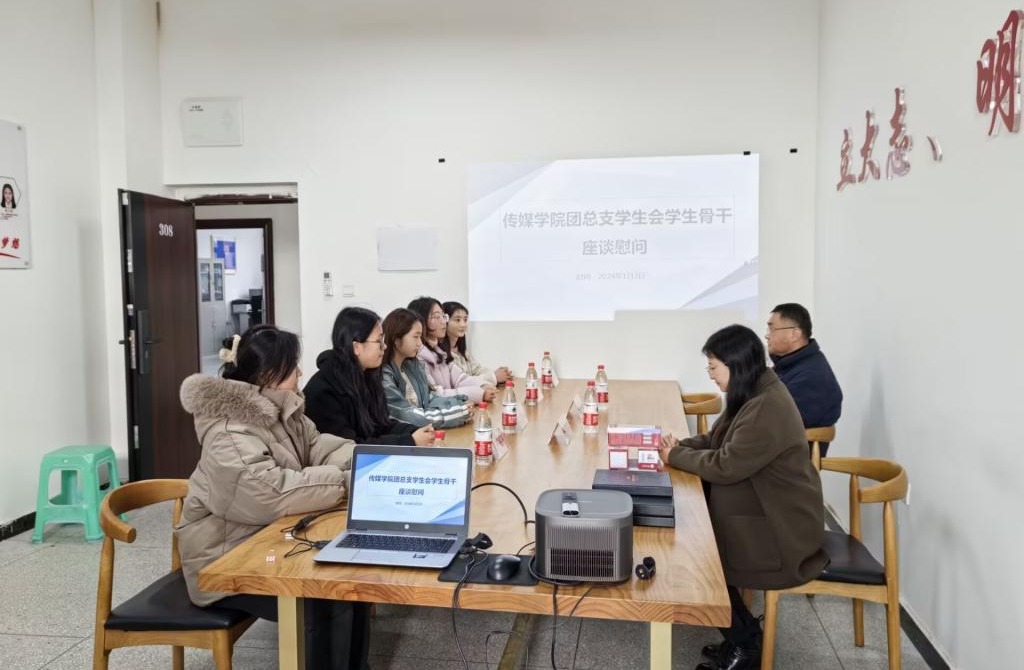 为把“党建带团建”工作落在实处,引导激励青年师生肩负新时代使命,提升学院共青团工作水平,1月3日上午,传媒学院在博学楼5C308团总支活动室举行了“党建带团建”师生座谈会。学校党委委员、传媒学院院长、党总支副书记韩红宇,学院党总支书记、副院长孙国英,学院副院长陈振华,学院团总支学生会主席团成员参会。会议由学院学工办副主任、团总支副书记蒋静静主持。