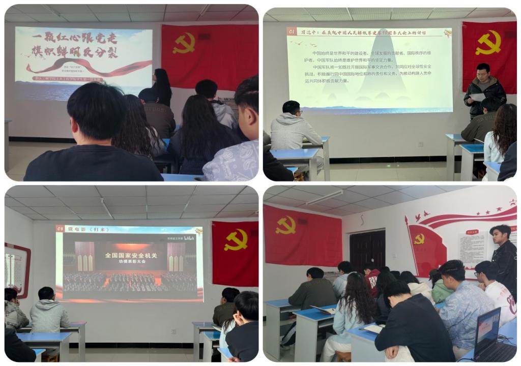 支部书记杨楠带领全体党员学习《反分裂国家法》,支部组织委员兼纪检委员李浪带领大家重温《习近平:在庆祝中国人民解放军建军90周年大会上的讲话》。之后大家观看微电影《归来》。影片讲述的是一个坚守背后的忠诚故事,代号“西山”的中共隐蔽战线情报员受党组织派遣,秘密赴台进行潜伏工作直至去世,展现了无论战火还是和平年代,中国共产党人始终坚守对党绝对忠诚的誓言。最后,各位党员同志作交流讨论后表示,此次主题党日活动激发了大家内心深处的爱国情怀,作为新时代共产党人要带头做到拥军爱民、维护祖国统一,不断增强政治敏锐性和斗争本领,勇于同不法分子作斗争,增强国家安全意识,筑牢国家安全防线。