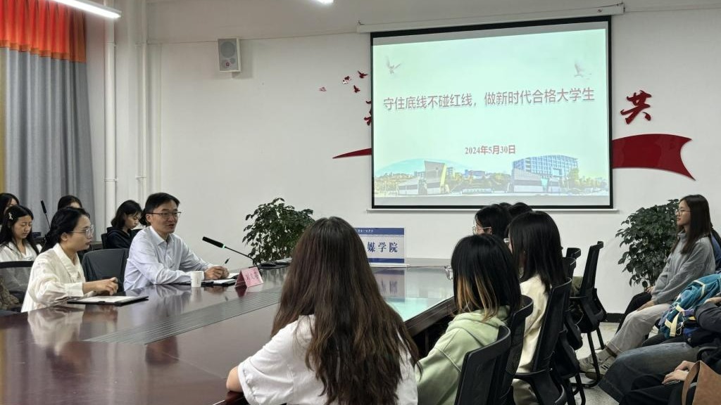5月30日上午,招生就业处党支部书记刘文菘为传媒学院2022级广告学1班全体同学作题为“守住底线不碰红线,做新时代合格大学生”的纪律党课。