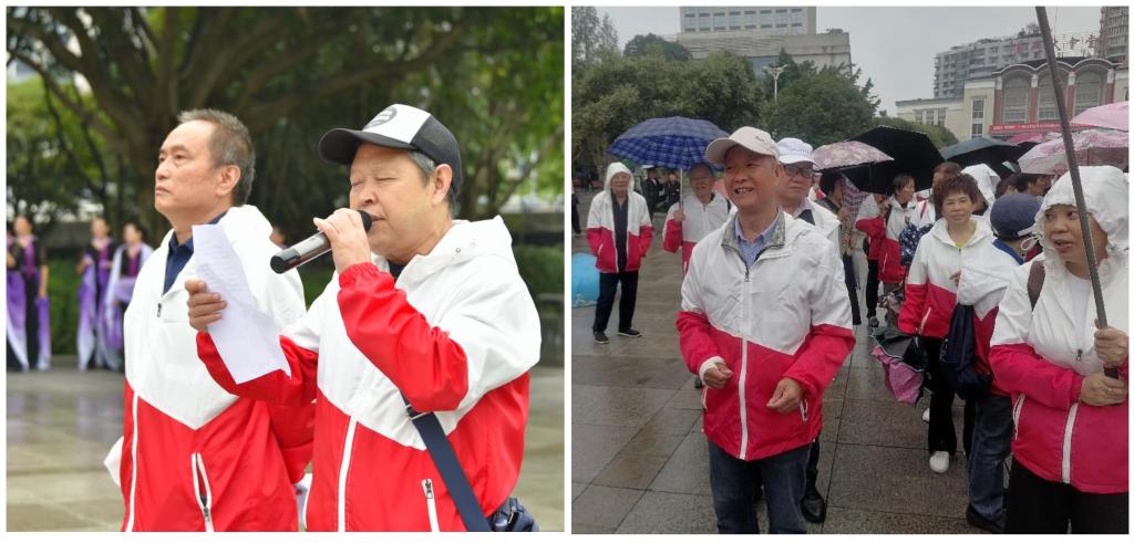 上午9时30分,活动正式开始。万州区太白老年登山协会462名登山爱好者和部分市民群众早早来到和平广场集中。队员们首先进行了健身操、舞道、曳步舞的表演,然后从和平广场出发开始健步走。大家迈着稳健的步伐,举着彩旗,高唱《没有共产党,就没有新中国》《我和我的祖国》等歌曲,高喊“运动重阳,全民健身”“平湖万州人人夸,健康美丽你我他”“健步行万里,健康我和你”等口号,且行且停,在欢声笑语中到达了移民广场。尽管天空下着雨,大家仍然神采奕奕 、精神抖擞,难掩心中的喜悦和舒爽,在运动中收获健康和快乐。