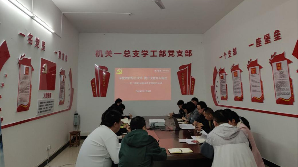 11月6日,学工部党支部在众创空间102围绕“深化教育综合改革 提升文化育人成效”开展专题学习。全体党员参加,党支部书记任江林主持会议。