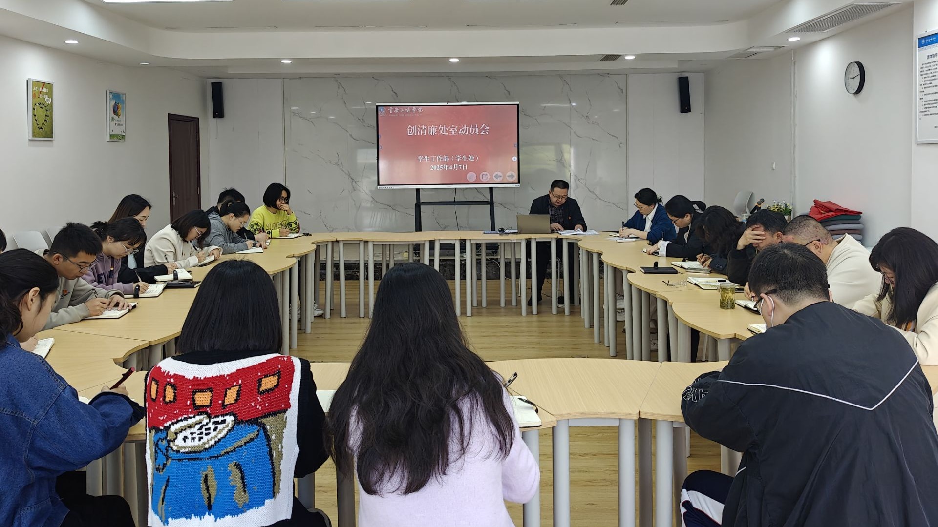 2025年4月7日,学工部党支部在众创空间102召开清廉处室创建动员会,会议由党支部书记任江林主持。