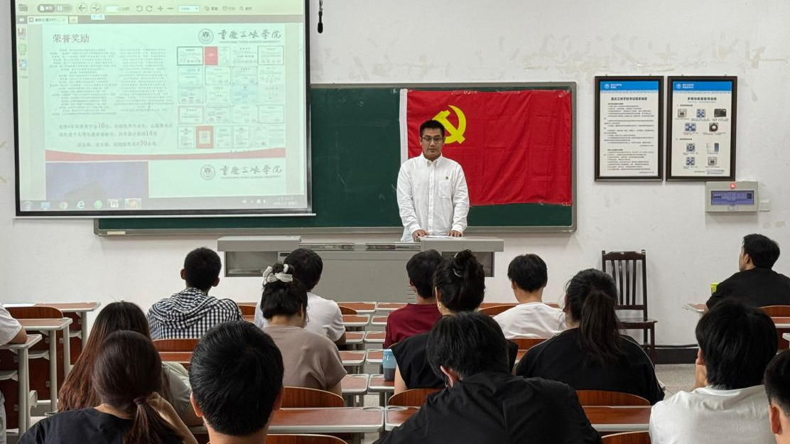 随后,2025年校长奖学金获得者韩彬同学分享了自己的成长历程、奋斗故事以及竞赛经验。从深耕机械、脚踏实地到奋楫扬帆、逐梦未来,他为同学们树立了榜样。2023级机械设计制造及其自动化专业的李世熔同学表示:“韩彬学长的经历让我深受触动,他用实际行动证明了奋斗的意义,也让我明白,严守纪律、踏实学习就是践行优良作风的最好方式。”