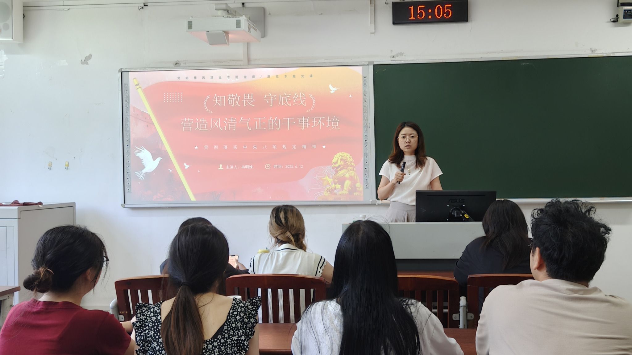 党支部书记冉明姝以“知敬畏、守底线,营造风清气正的干事环境”为题,为全体党员讲授专题党课。她指出,党员干部要做到自身正、自身硬,严格遵守政治纪律和政治规矩,锲而不舍落实中央八项规定精神,始终知敬畏、存戒惧、守底线、做表率。