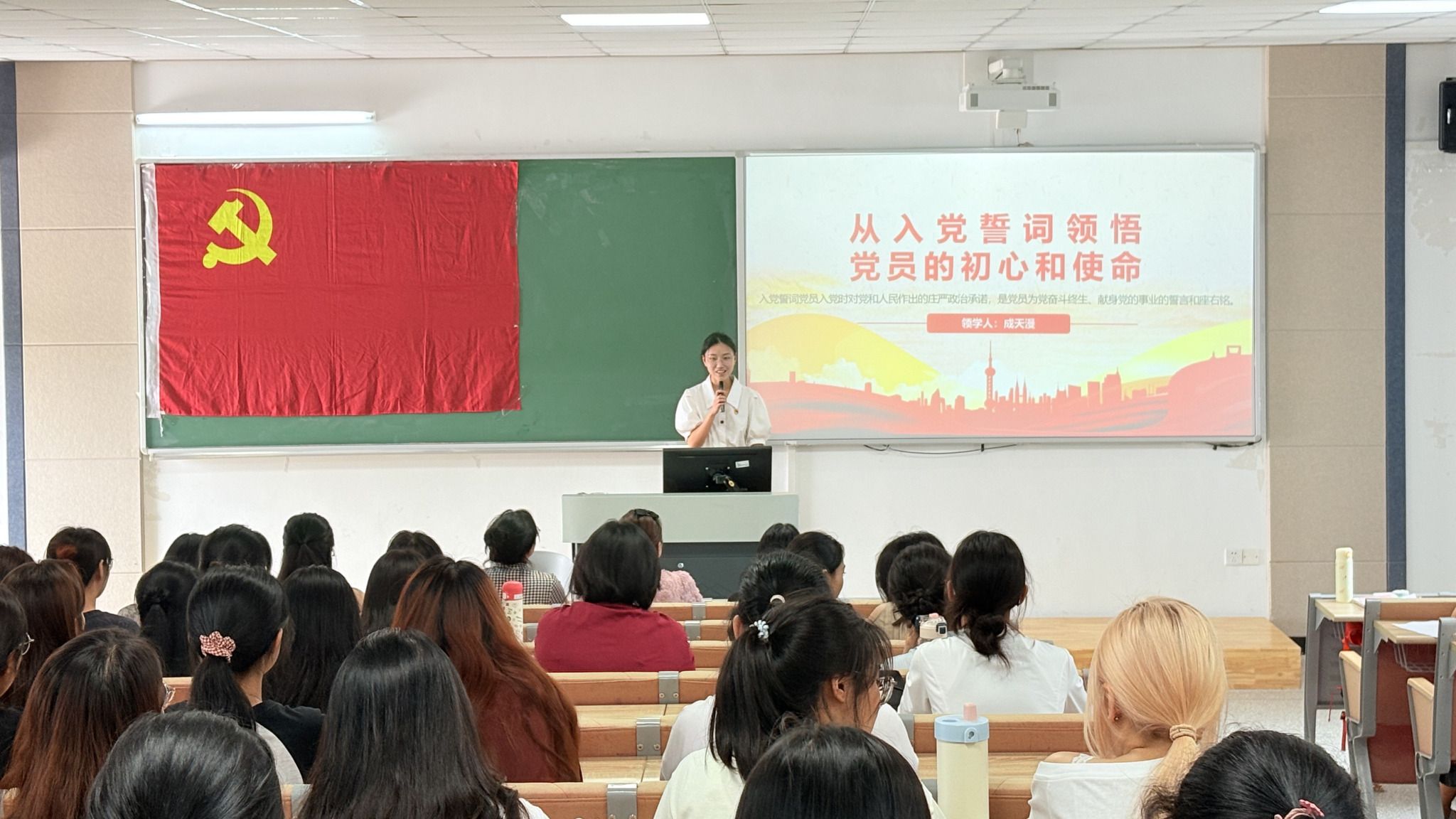 周子钦站于前方,右手握拳举过肩头,面向党旗,带领第18期预备党员重温入党誓词。她表示,今天新一批同志光荣加入中国共产党。从这一刻起,你们的肩上多了一份沉甸甸的责任。入党誓词的每一字、每一句,都凝结着共产党人的初心与使命。希望你们以优秀党员同志为榜样,主动学习党的理论,在实践中锤炼本领,用实际行动诠释“请党放心,强国有我”的青春誓言。
