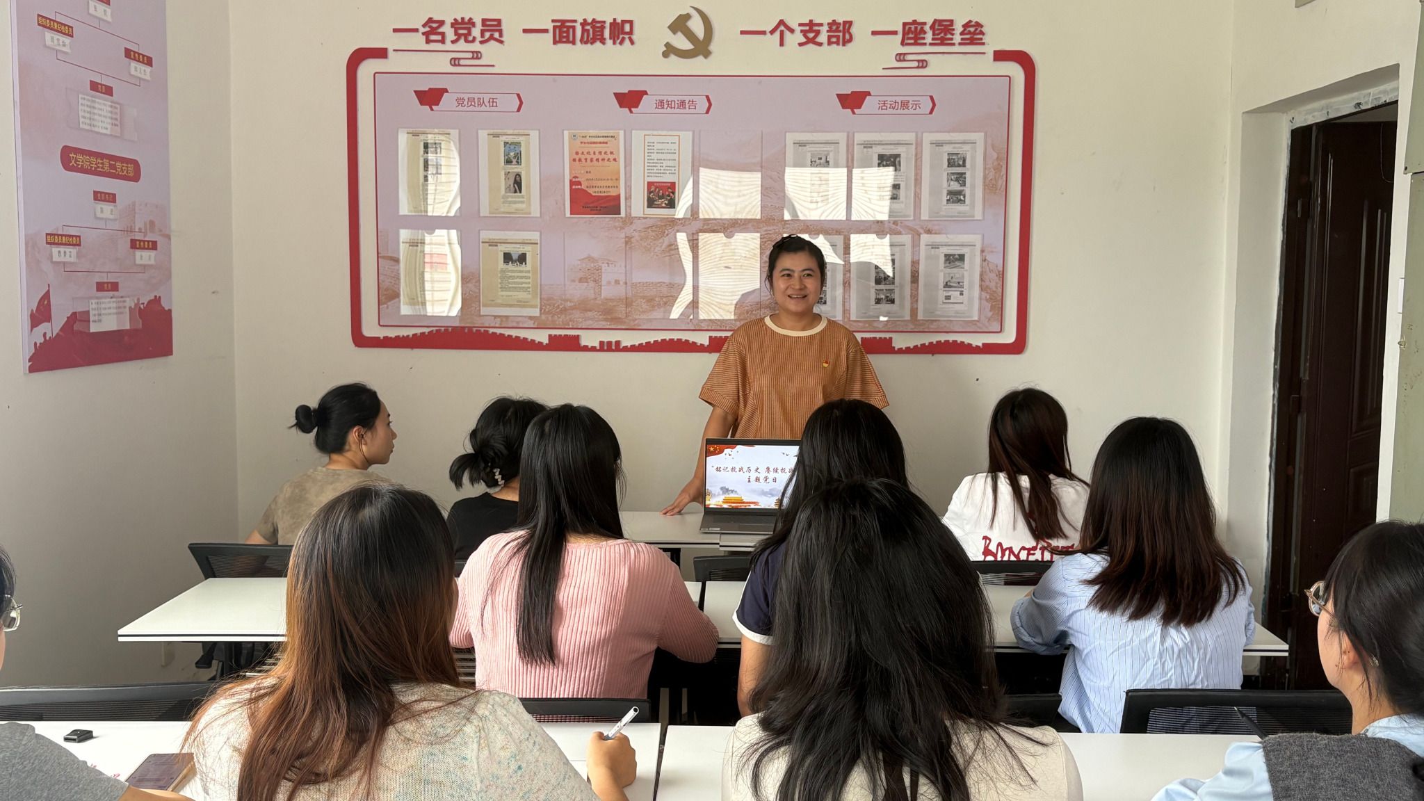 为铭记抗战历史、传承红色基因,凝聚党员奋进力量,9月25日下午,文学院学生党支部于桂花苑4舍419党员活动室开展“铭记抗战历史,赓续抗战精神”主题党日活动。学生党支部书记张悦、陈进及党支部全体在校党员共同参与此次活动。