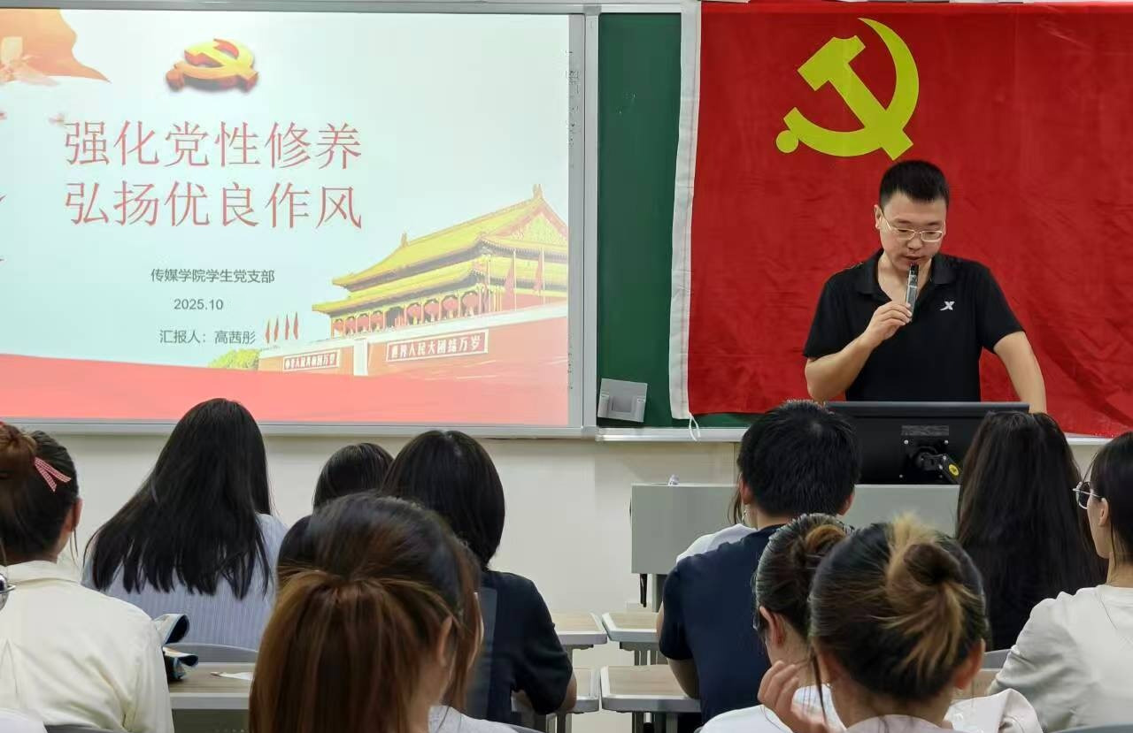 10月,传媒学院学生党支部在博学楼2栋112教室以“强化党性修养,弘扬优良作风”为主题开展活动,活动由党支部书记石张主持,党支部党员同志参会。