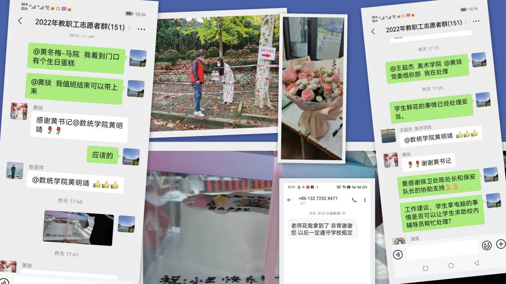 “老师,蛋糕和鲜花我拿到了,非常谢谢您。”这条短信来自公共管理学院的一名学生。突如其来的疫情,使学生亲友之前为其订购的生日蛋糕和鲜花无法收取,数学与统计学院党总支书记黄明靖作为志愿者第一时间了解了相关情况,在坚持原则的前提下,切实关心关爱学生的学习生活困难,有温度地开展工作。她在学校保安队长的配合下,及时将蛋糕和鲜花亲自送到了学生手上。当学生接过蛋糕和鲜花的一瞬间,顿时感动得热泪盈眶,表示这是她一生中最难忘地一次生日。