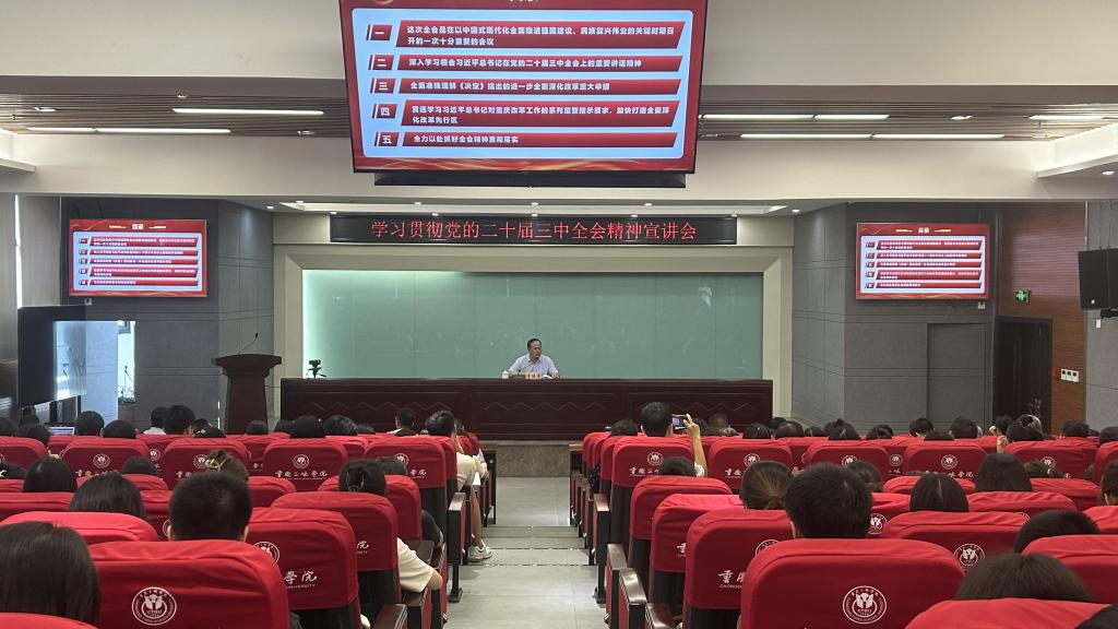 9月27日,学校党委书记李廷勇在科技楼二楼连廊会议室宣讲党的二十届三中全会精神。文学院、马克思主义学院师生近200人到会聆听宣讲。