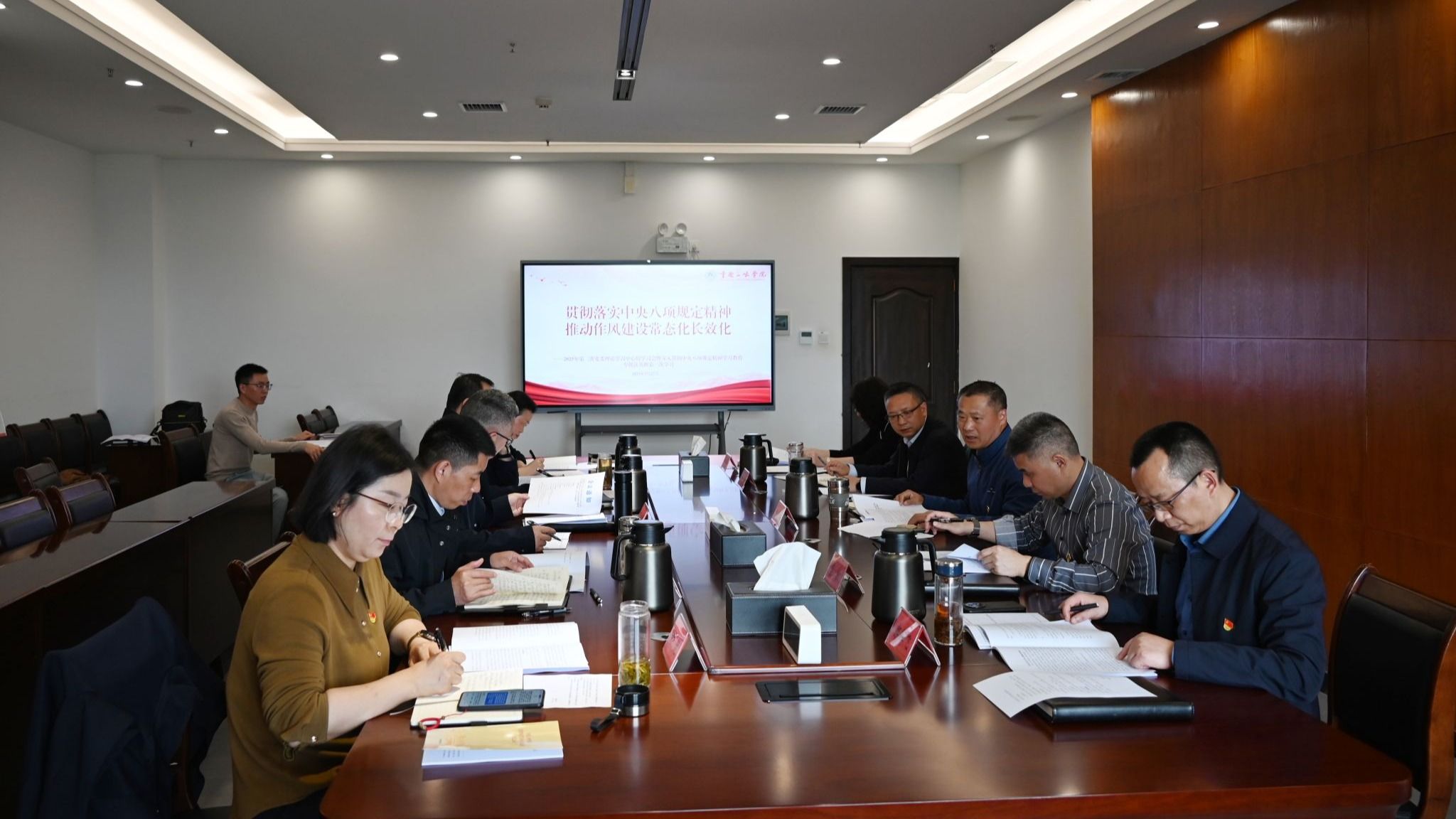 3月27日,学校党委组织召开第三次中心组学习会暨深入贯彻中央八项规定精神学习教育专题读书班第一次学习会,围绕“贯彻落实中央八项规定精神 推动作风建设常态化长效化”开展学习研讨。会议集中学习了中央八项规定及其实施细则、习近平总书记关于中央八项规定的重要论述,集中观看了警示教育视频,传达了上级重要文件。党委书记许光洪主持学习并讲话。